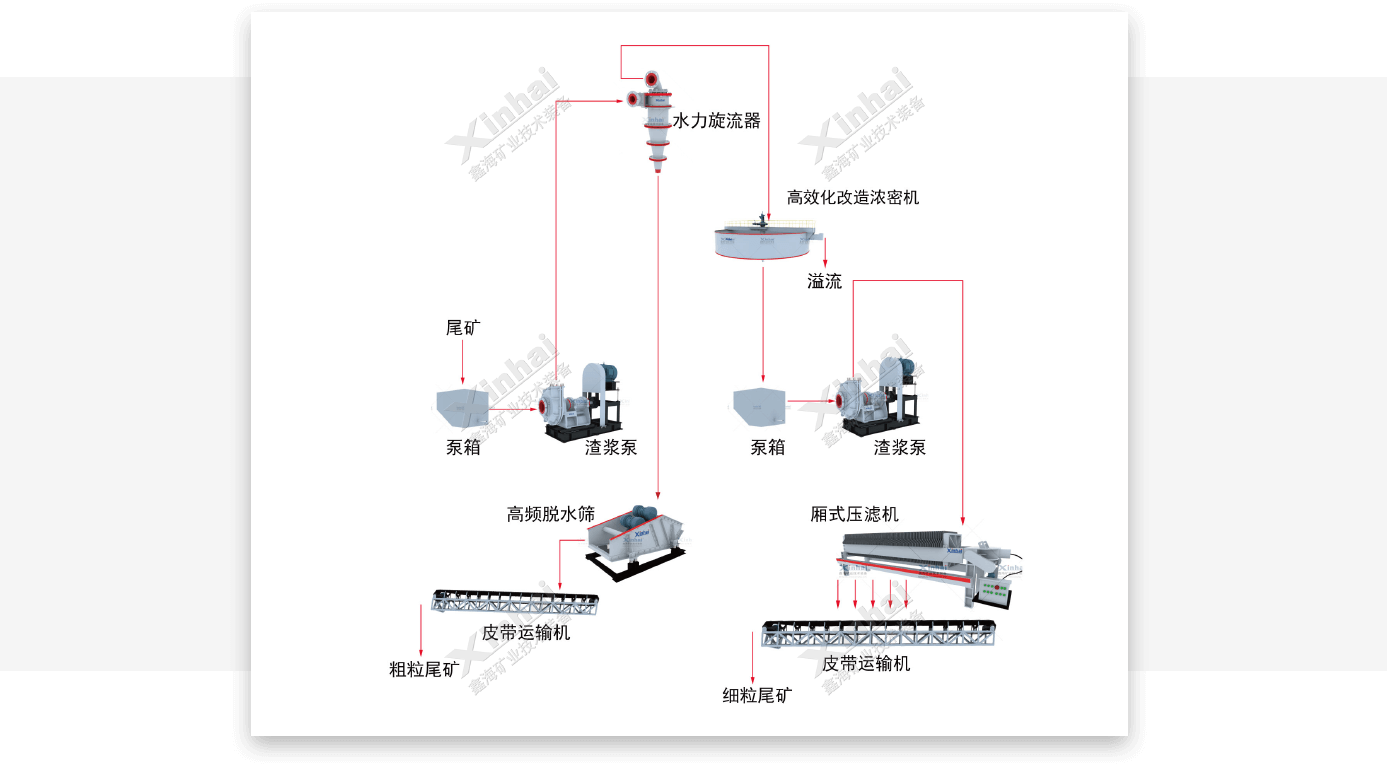 其中尾礦干排系統(tǒng)由濃縮脫水型水力旋流器、高效深錐多錐濃密機、高效多頻脫水篩聯(lián)合組成。鑫海選礦專家們已針對尾礦干排流程對這些設(shè)備進行了創(chuàng)新設(shè)計,各設(shè)備之間環(huán)環(huán)相扣、完美結(jié)合。鑫海尾礦干排系統(tǒng)的排水率可高達95%,藥劑回收率可達90%,并且節(jié)能高效,操作簡單,對工人技術(shù)要求低。